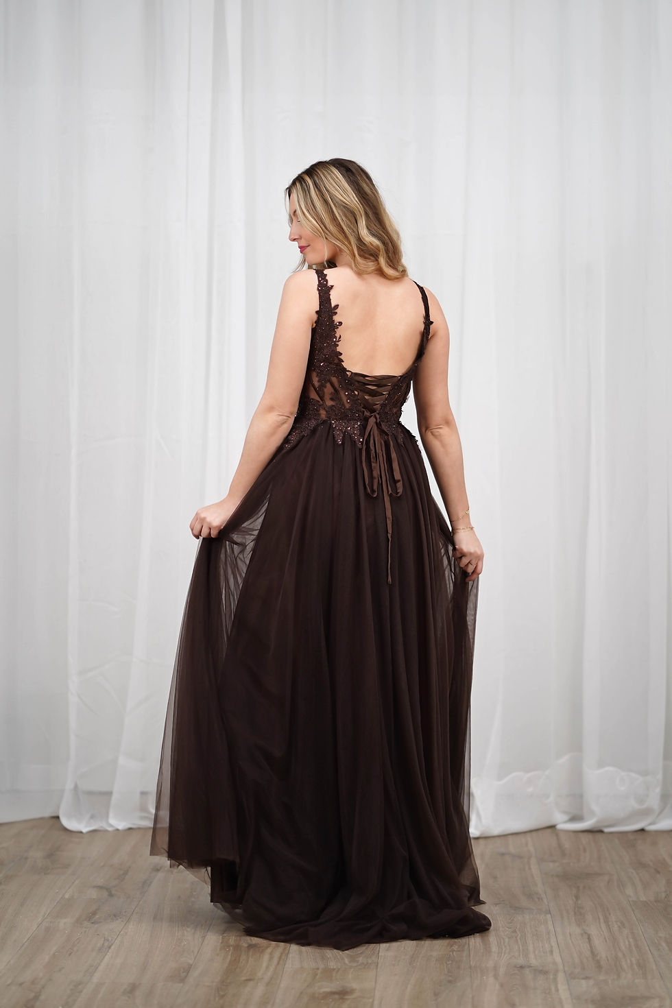 • This is a Queen Size long bridesmaid dress in bottle green with butterfly sleeves. It is fully lined and has cups at the chest. The back is elastic.